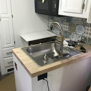 The kitchen sink and counters were the next monster to take down. We decided on utilizing butcher block that was already complete as it was a time saver and Lowes had a deal on it. What was not anticipated however was the weight of this monster. I was slightly shocked to say the least after I get that monster up there to start the plan. Thankfully, it all worked out after some minor technical issues (get the right blade on your saw before cutting this, you'll thank me later) and a couple of oops moments (no blood was spilt) it was installed. We opted for a residential faucet mostly for the looks and use of it. The original was just not going to be able to cut it, and I kinda broke it. The stove top arrived the next day and the process was repeated (sans issues). Unfortunately in the pictures you cannot see it, but on the left of the stove, I cut out knife holders through the butcher block. I didn't want a magnetic with the constant rocking and rolling and our drawer situation was not idea for this. Now the rest of the area under the stove was wide open to hold all our pots, pans, cutting boards, and anything else kitchen related for storage that we were missing before. One thing I didn't love that Rexhall did was waste a bunch of cabinet space under the sink. From the door to the wall you can put stuff in there, but it is in the dark dungeon of forgotten things so anything put in there will be likely forgotten. I was going to put a hole in and a door but decided against it. I was running out of time.
