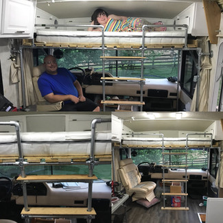 Figuring out a space for Abby was something that we had worried about from the start. Jennie found a blog of another full-time family that created a bed above the drivers area. It was a thing of beauty with the way the stained it and built it. Jennie reached out to them and they happily gave us some advice and information on how they did it. I'll admit, I felt like we were talking to celebrities when they emailed us back as they have been featured several times for their renovation and rig. So I followed what the said and made my adjustments for our rig. A whole lotta 3/4" steel, connectors, wood, and ingenuity was used to make this monster. One thing about me, I over engineer things. I always have when I'm working on a project that someone is going to use. This was no different. Pressure mounted it to the right & left sides so we didn't penetrate the skin, hard mounted for fore & aft motion to the cabinets above the driver, four fittings into the deck with thick screws, and extra lateral support beams to reduce any shaking. If we ever rolled over in the RV (God, please don't let that happen) I had created my very own roll cage. Oh, and Abby's comfortable bed too.