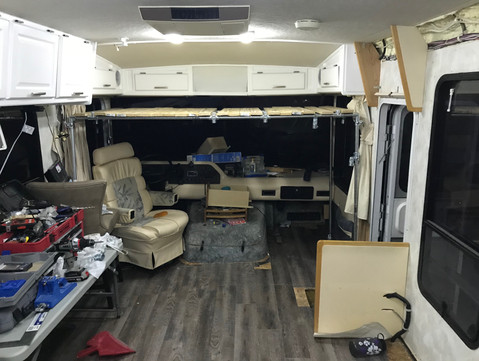 We had finally moved from demolition mode to rebuild time. We started out with the flooring. We had originally planned a lock style floor board type but after reading some reviews and lessons learned from other RVers, we realized that was a bad idea. It is after, a constant rolling earthquake as you go down the road. We decided to go with a vinyl glue type instead. It is scratch resistant, easy to put down, and simple to maintain. BEFORE you put down floors in an RV, you must make sure that you get up EVERY SPECK OF DIRT off the floor. If you don't it will show up as a nice pimple under your floor board. Not that we know of course, we have just heard of this happening.......you believe me right? I didn't think so. We found that issue, fixed it, and also added a primer to the floor as well to ensure that the boards stuck. One year later, they are all still holding thankfully and we have spares just in case we need to replace a few. The cutting and aligning was extremely simple and nearly painless. This was a huge boost in moral/happiness for us to see this because it really gave us the sense of progress.